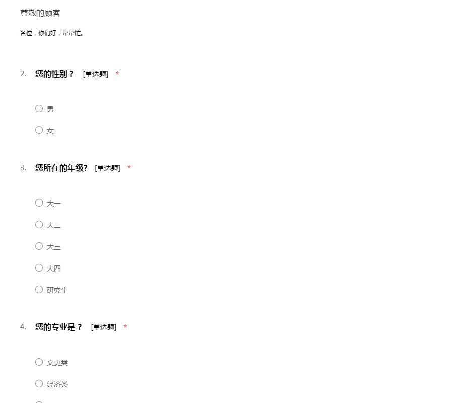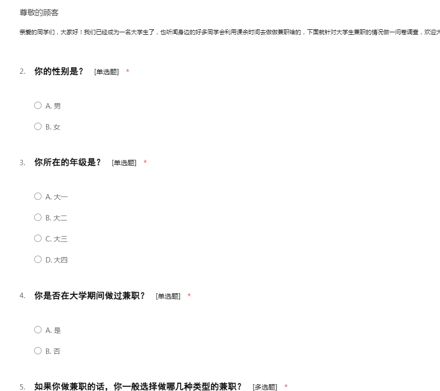 亲爱的同学们,大家好!我们已经成为一名大学生了,也听闻身边的好多同学会利用课余时间去做做兼职啥的,下面就针对大学生兼职的情况做一问卷调查,欢迎大家填写哦!