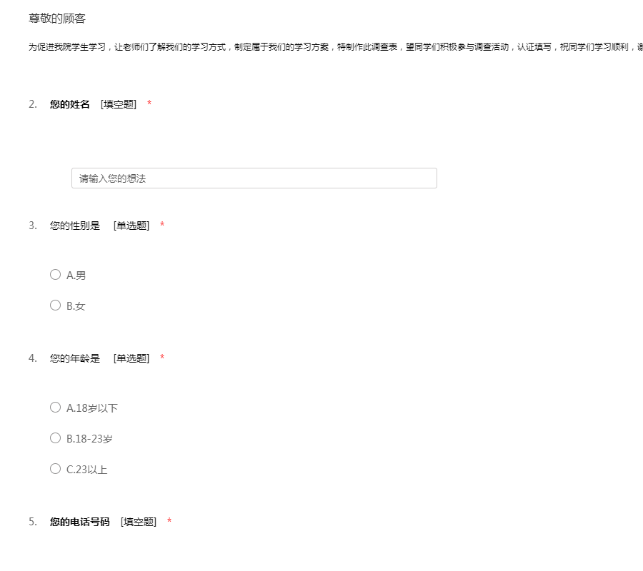 为促进我院学生学习,让老师们了解我们的学习方式,制定属于我们的学习方案,特制作此调查表,望同学们积极参与调查活动,认证填写,祝同学们学习顺利,谢谢支持。