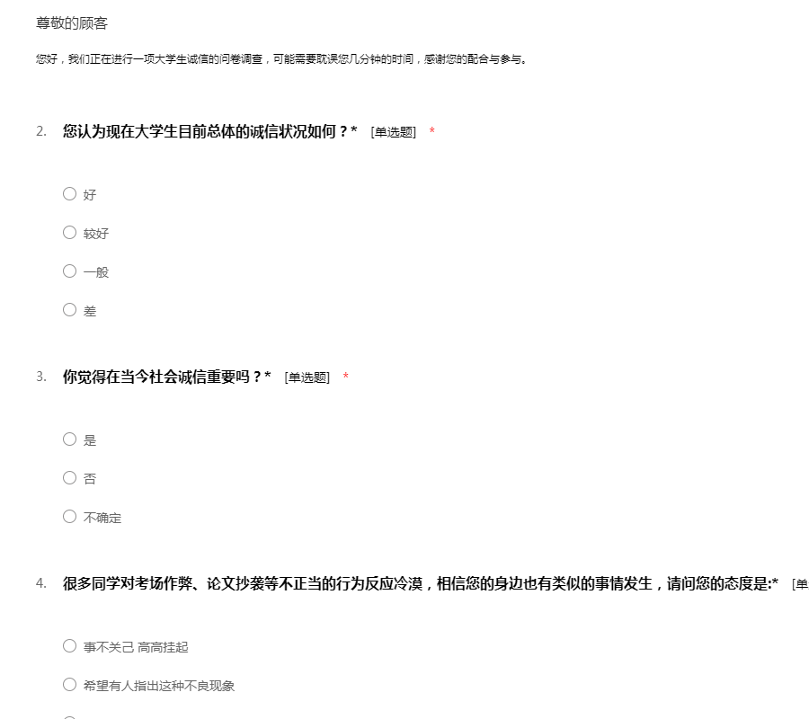 您好,我们正在进行一项大学生诚信的问卷调查,可能需要耽误您几分钟的时间,感谢您的配合与参与。