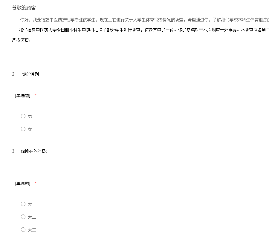 你好,我是福建中医药护理学专业的学生,现在正在进行关于大学生体育锻炼情况的调查,希望通过你,了解我们学校本科生体育锻炼的真实情况。 我们福建中医药大学全日制本科生中随机抽取了部分学生进行调查,你是其中的一位。你的参与对于本次调查十分重要。本调查匿名填写,答案没有对错之分,你提供的情况我将严格保密。