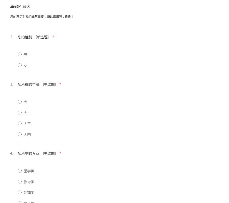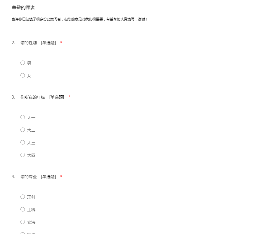 也许你已经填了很多份此类问卷,但您的意见对我们很重要,希望帮忙认真填写,谢谢!