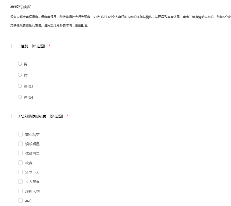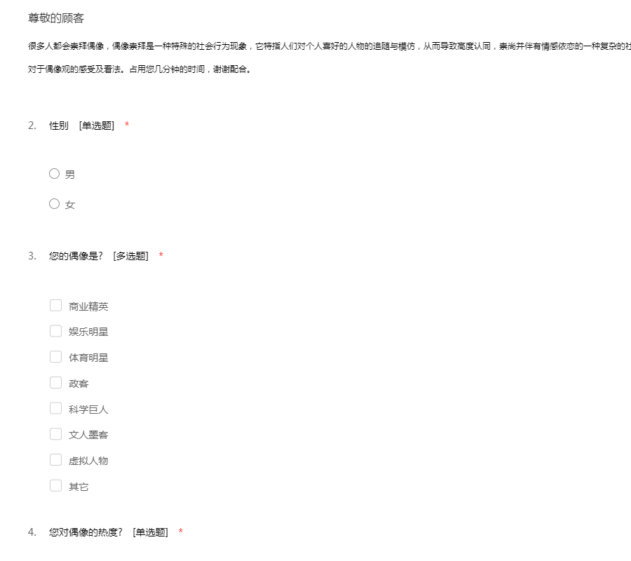 很多人都会崇拜偶像,偶像崇拜是一种特殊的社会行为现象,它特指人们对个人喜好的人物的追随与模仿,从而导致高度认同,崇尚并伴有情感依恋的一种复杂的社会行为。我们调查的目标,就是了解大学生朋友对于偶像观的感受及看法。占用您几分钟的时间,谢谢配合。
