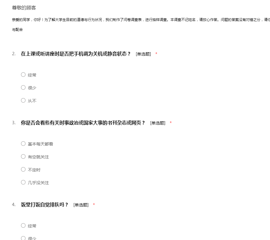 亲爱的同学,你好!为了解大学生目前的道德与行为状况,我们制作了问卷调查表,进行抽样调查。本调查不记姓名,请放心作答。问题的答案没有对错之分,请你根据自己的实际情况填写。 衷心感谢你的支持与配合