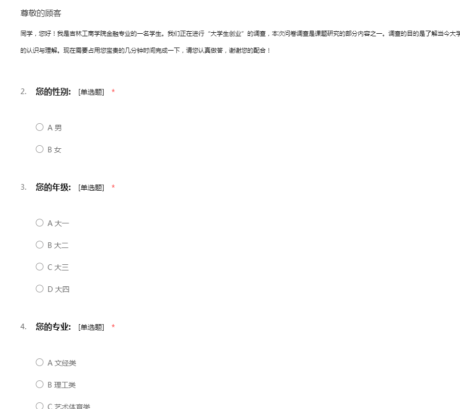 同学,您好!我是吉林工商学院金融专业的一名学生。我们正在进行“大学生创业”的调查,本次问卷调查是课题研究的部分内容之一。调查的目的是了解当今大学生对创业行为,创业教育,创业政策,创业环境的认识与理解。现在需要占用您宝贵的几分钟时间完成一下,请您认真做答,谢谢您的配合!