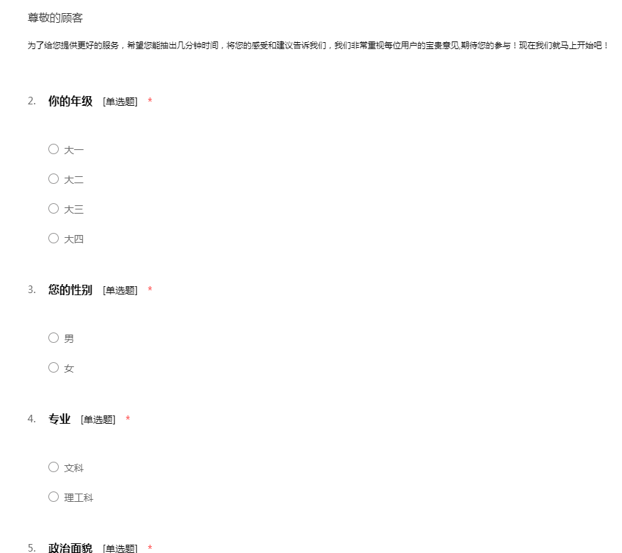 为了给您提供更好的服务,希望您能抽出几分钟时间,将您的感受和建议告诉我们,我们非常重视每位用户的宝贵意见,期待您的参与!现在我们就马上开始吧!