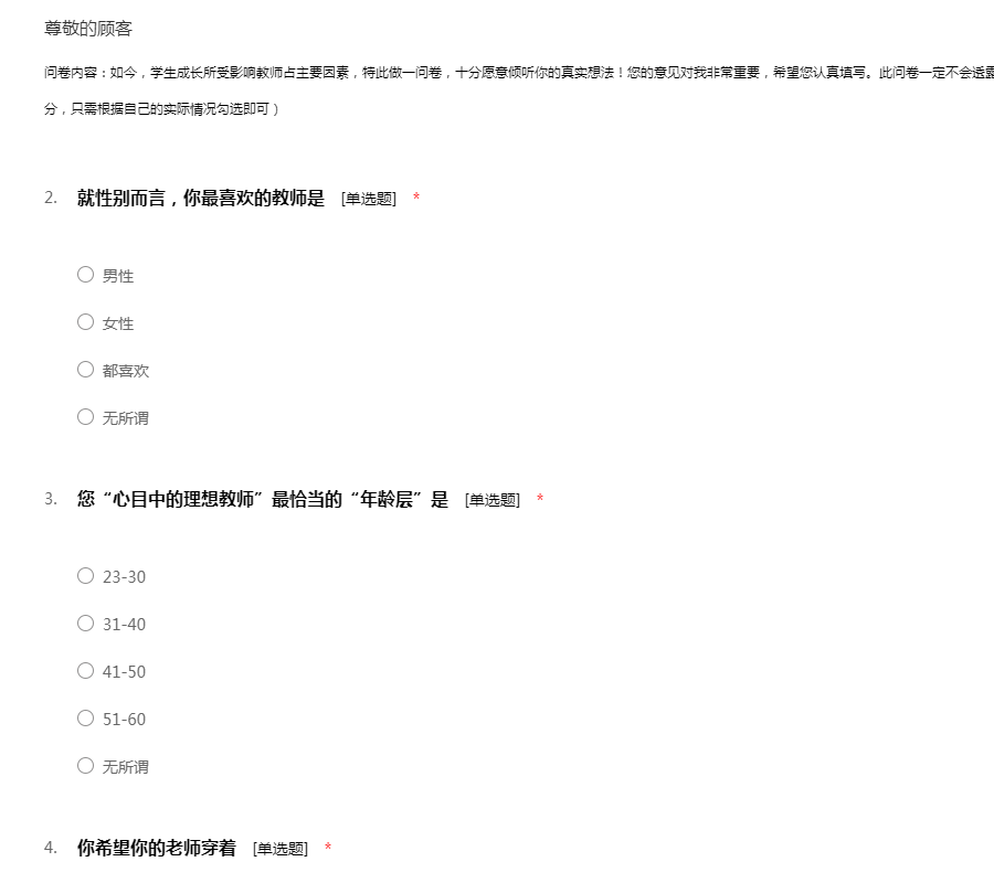 问卷内容:如今,学生成长所受影响教师占主要因素,特此做一问卷,十分愿意倾听你的真实想法!您的意见对我非常重要,希望您认真填写。此问卷一定不会透露您的私人信息,请放心填写。(问卷没有对错之分,只需根据自己的实际情况勾选即可)