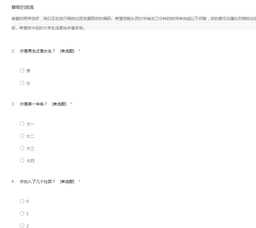 亲爱的同学您好,我们正在进行高校社团发展现状的调研。希望您能从百忙中抽出三分钟的时间来完成以下问卷,您的意见与建议对高校社团的发展和校园文化的丰富有着重要的促进,希望您今后的大学生活更加丰富多彩。