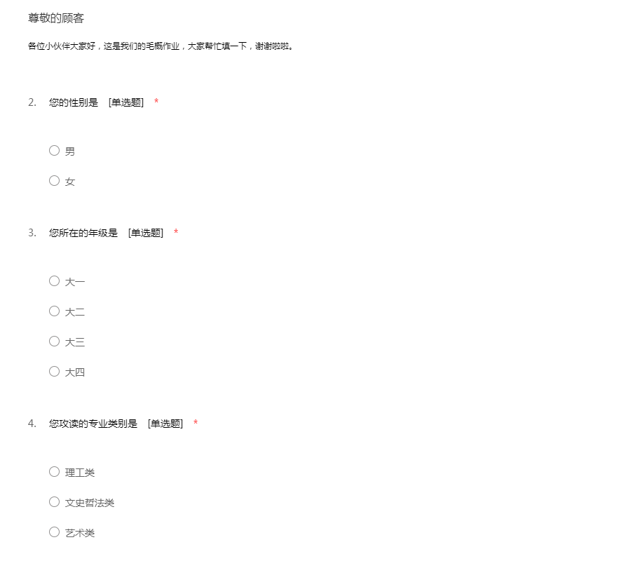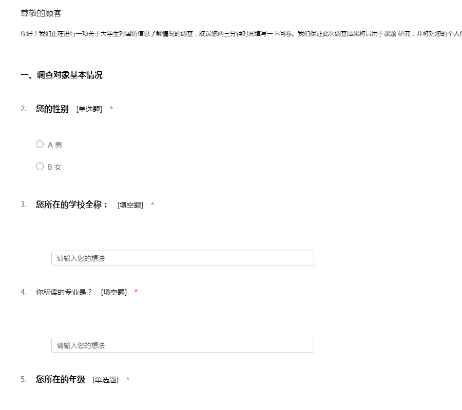 你好!我们正在进行一项关于大学生对国防信息了解情况的调查,耽误您两三分钟时间填写一下问卷。我们保证此次调查结果将只用于课题 研究,并将对您的个人信息完全保密,非常感谢您对我们工作的支持!