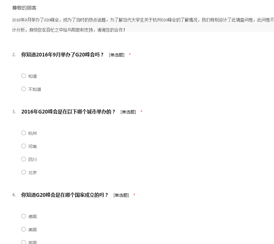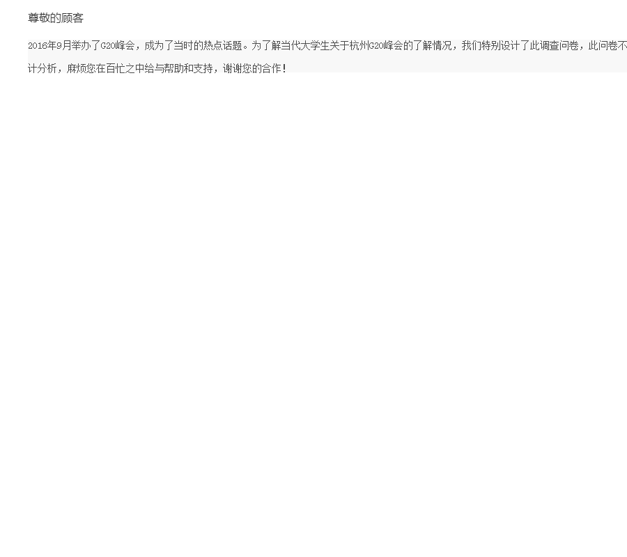 2016年9月举办了G20峰会,成为了当时的热点话题。为了解当代大学生关于杭州G20峰会的了解情况,我们特别设计了此调查问卷,此问卷不记姓名,并且您所提供的数据将只用于统计分析,麻烦您在百忙之中给与帮助和支持,谢谢您的合作!