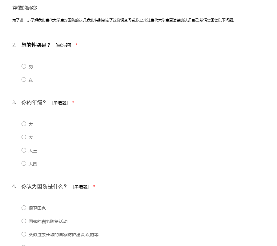 为了进一步了解我们当代大学生对国防的认识,我们特别制定了这份调查问卷,以此来让当代大学生更清楚的认识自己,敬请您回答以下问题。