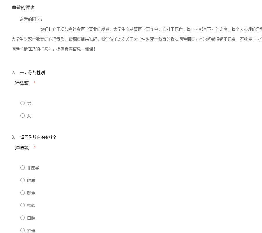亲爱的同学: 你好!介于现如今社会医学事业的发展,大学生在从事医学工作中,面对于死亡,每个人都有不同的态度,每个人心理的承受范围不同,为了能够收集更多数据了解大学生对死亡教育的心理素质,使调查结果准确,我们做了此次关于大学生对死亡教育的看法问卷调查。本次问卷调卷不记名,不收集个人信息,希望你能从百忙之中抽出时间完成问卷(请在选项打勾),提供真实信息,谢谢!