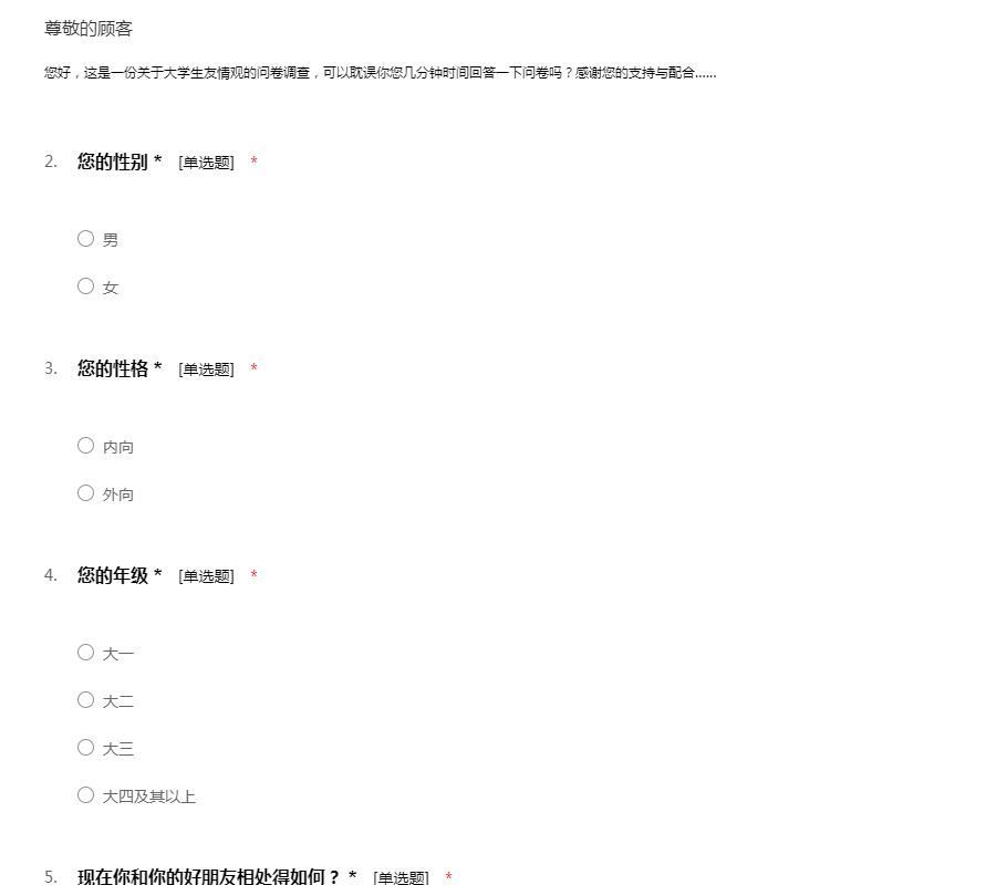 您好,这是一份关于大学生友情观的问卷调查,可以耽误你您几分钟时间回答一下问卷吗?感谢您的支持与配合……