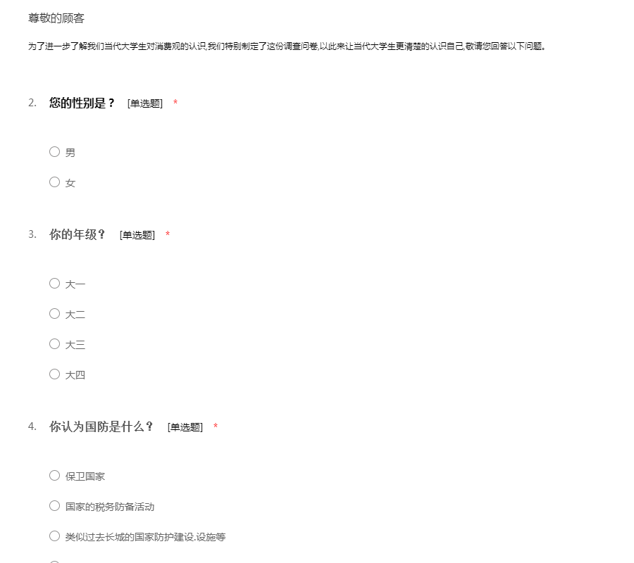 为了进一步了解我们当代大学生对消费观的认识,我们特别制定了这份调查问卷,以此来让当代大学生更清楚的认识自己,敬请您回答以下问题。
