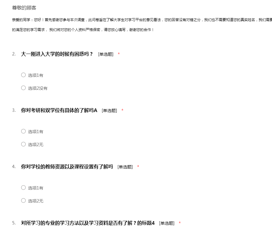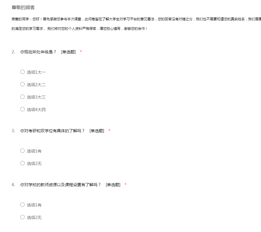 亲爱的同学:您好!首先感谢您参与本次调查,此问卷旨在了解大学生对学习平台的意见看法,您的回答没有对错之分,我们也不需要知道您的真实姓名,我们需要知道的是您对每个问题的真实看法,以便更有效的满足您的学习需求, 我们将对您的个人资料严格保密,请您放心填写,谢谢您的合作!