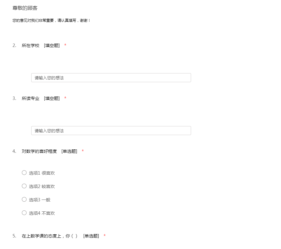 您好!该问卷问题简明,却直播当代大学生普遍存在的专业认知、就业迷茫的问题。你们的意见对我们非常重要,希望同学们能根据自身的感受认真填写,谢谢合作!
