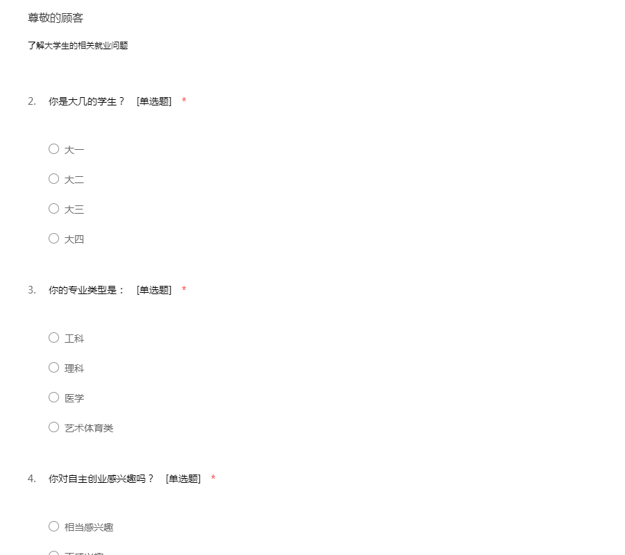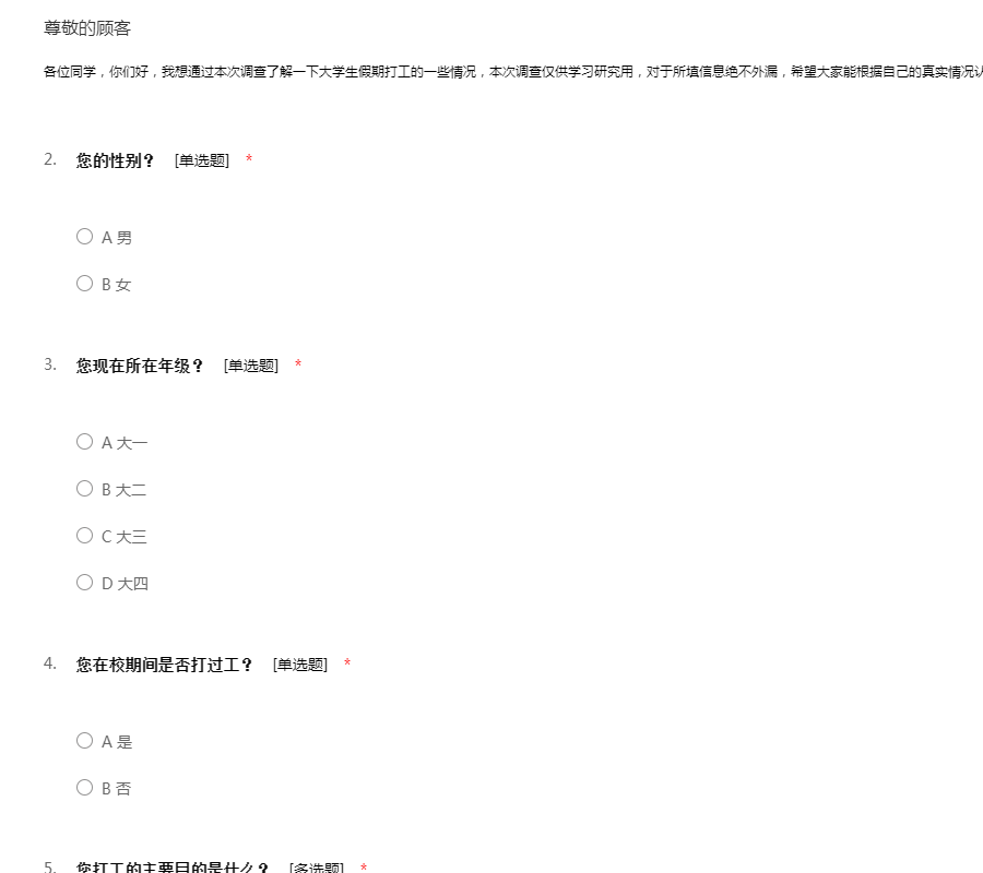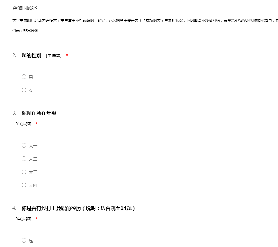 大学生兼职已经成为许多大学生生活中不可或缺的一部分,这次调查主要是为了了我校的大学生兼职状况,你的回答不涉及对错,希望您能按你的实际情况填写,我们会对你的回答予以保密。 对于你的合作,我们表示非常感谢!