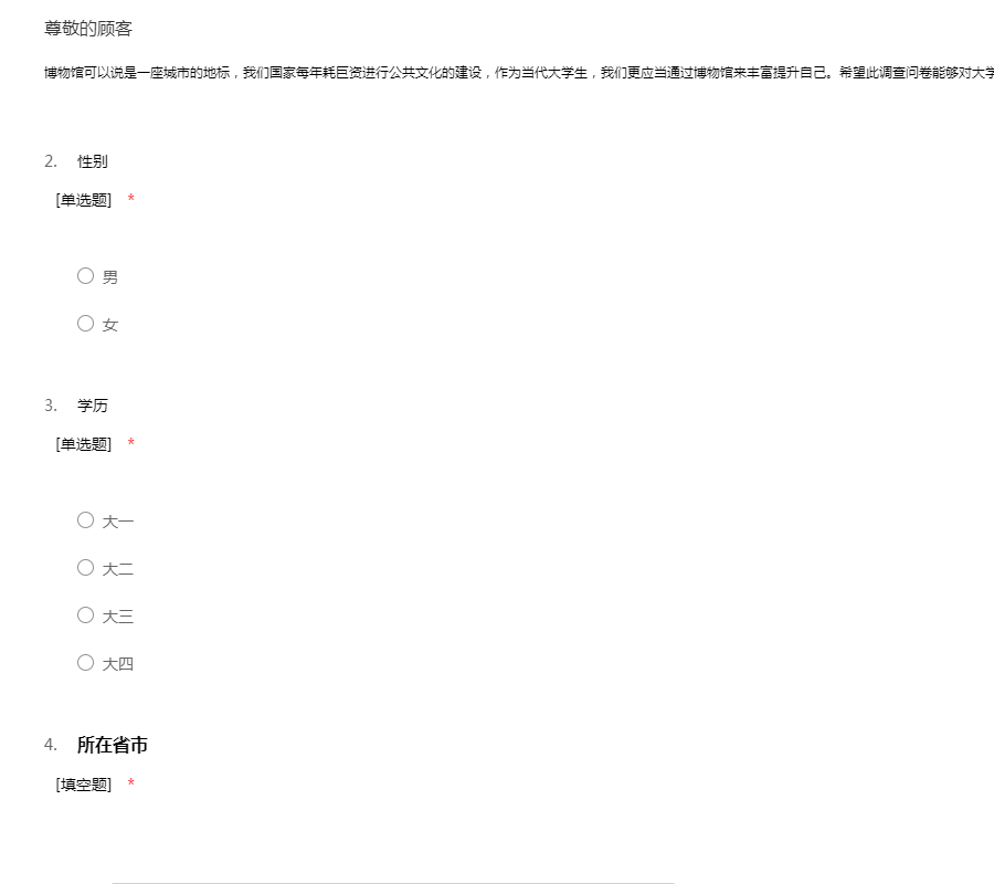博物馆可以说是一座城市的地标,我们国家每年耗巨资进行公共文化的建设,作为当代大学生,我们更应当通过博物馆来丰富提升自己。希望此调查问卷能够对大学生对博物馆的参观情况以及态度有所反应。