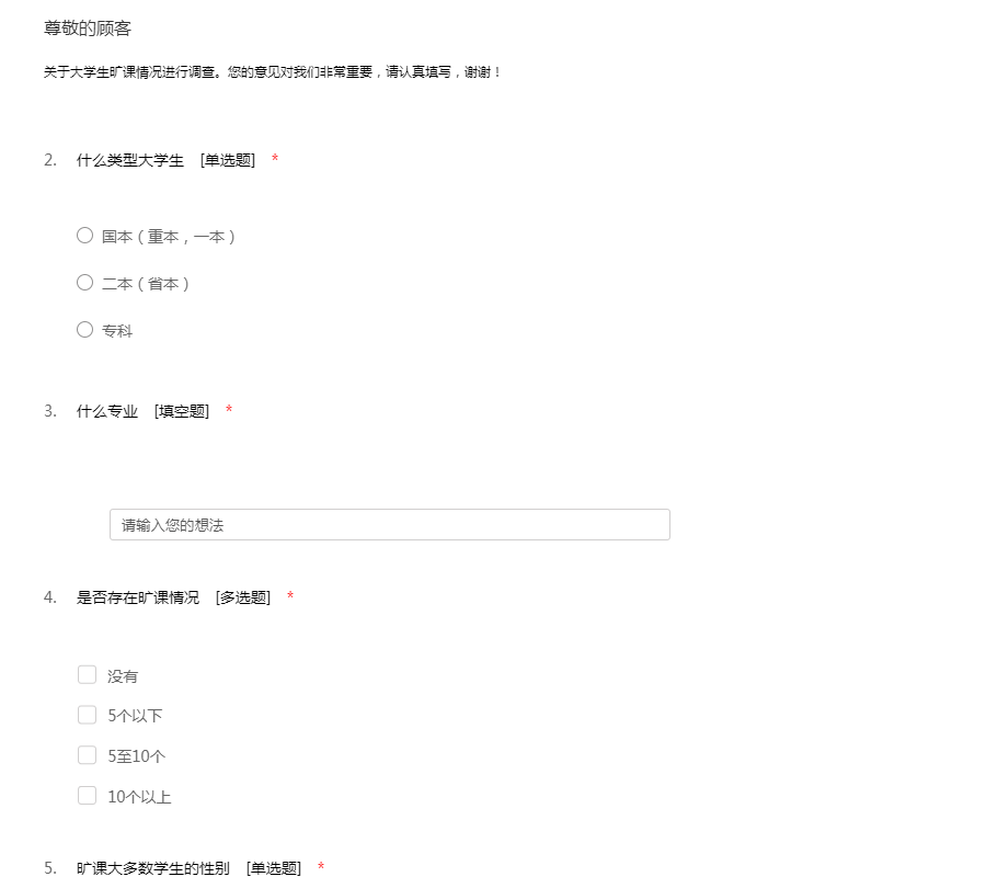 关于大学生旷课情况进行调查。您的意见对我们非常重要,请认真填写,谢谢!