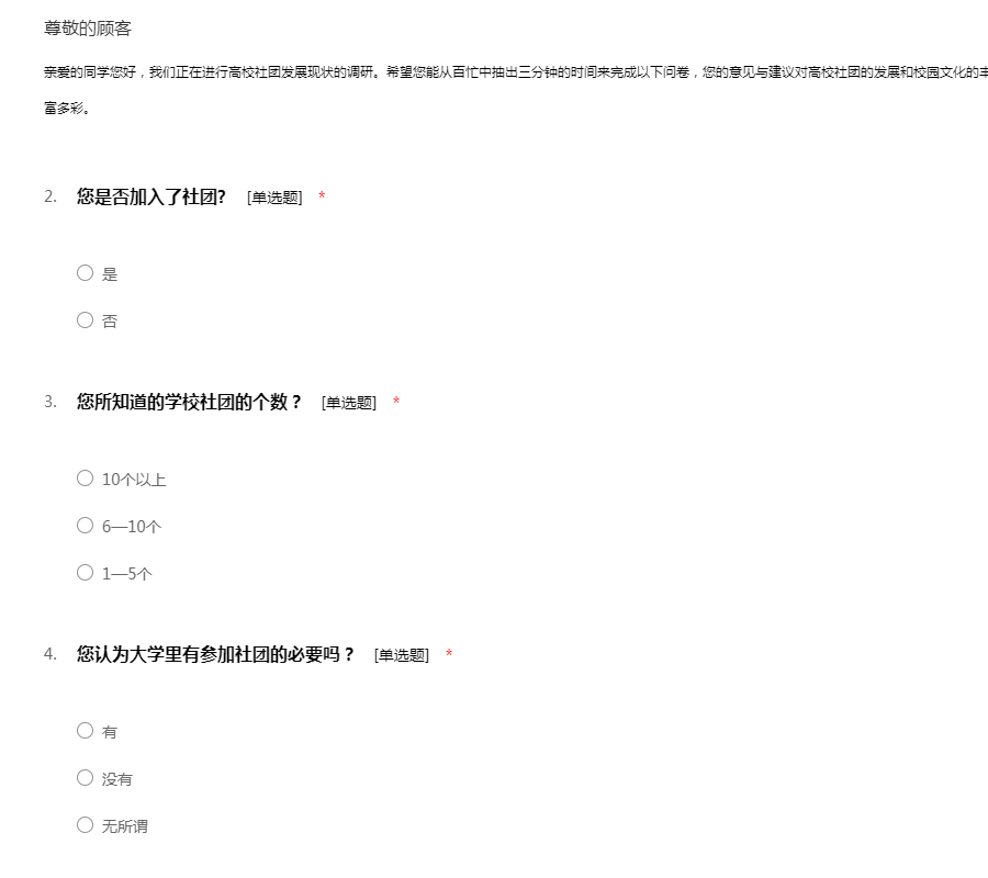 亲爱的同学您好,我们正在进行高校社团发展现状的调研。希望您能从百忙中抽出三分钟的时间来完成以下问卷,您的意见与建议对高校社团的发展和校园文化的丰富有着重要的促进,使您今后的大学生活更加丰富多彩。