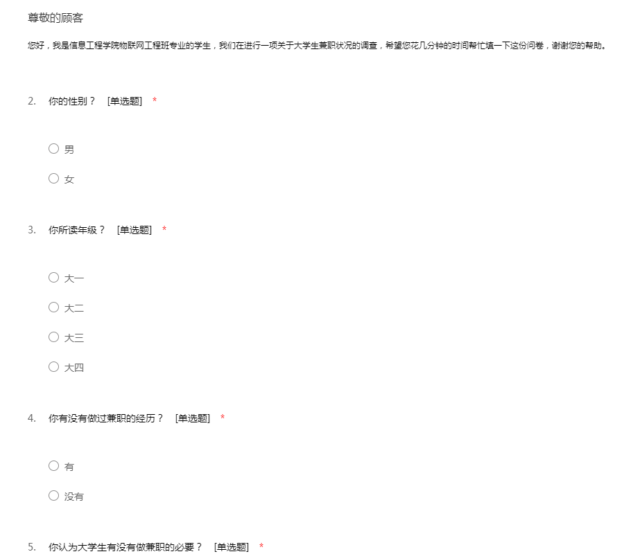 您好,我是信息工程学院物联网工程班专业的学生,我们在进行一项关于大学生兼职状况的调查,希望您花几分钟的时间帮忙填一下这份问卷,谢谢您的帮助。
