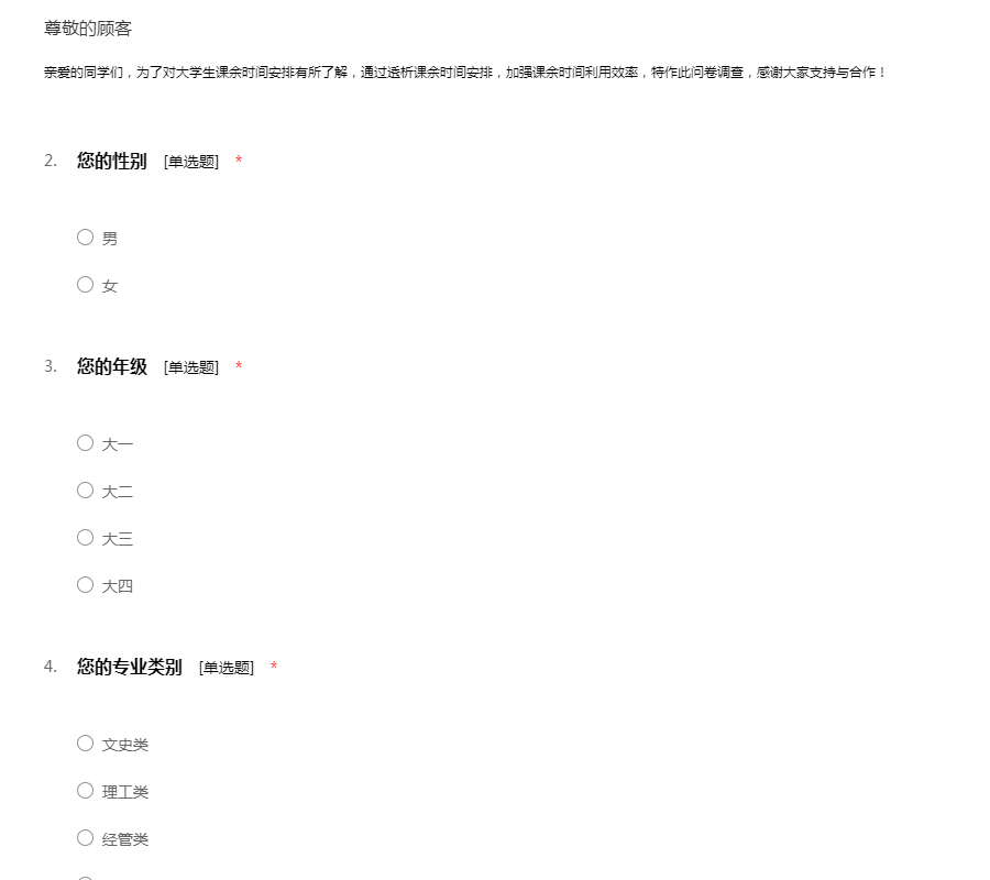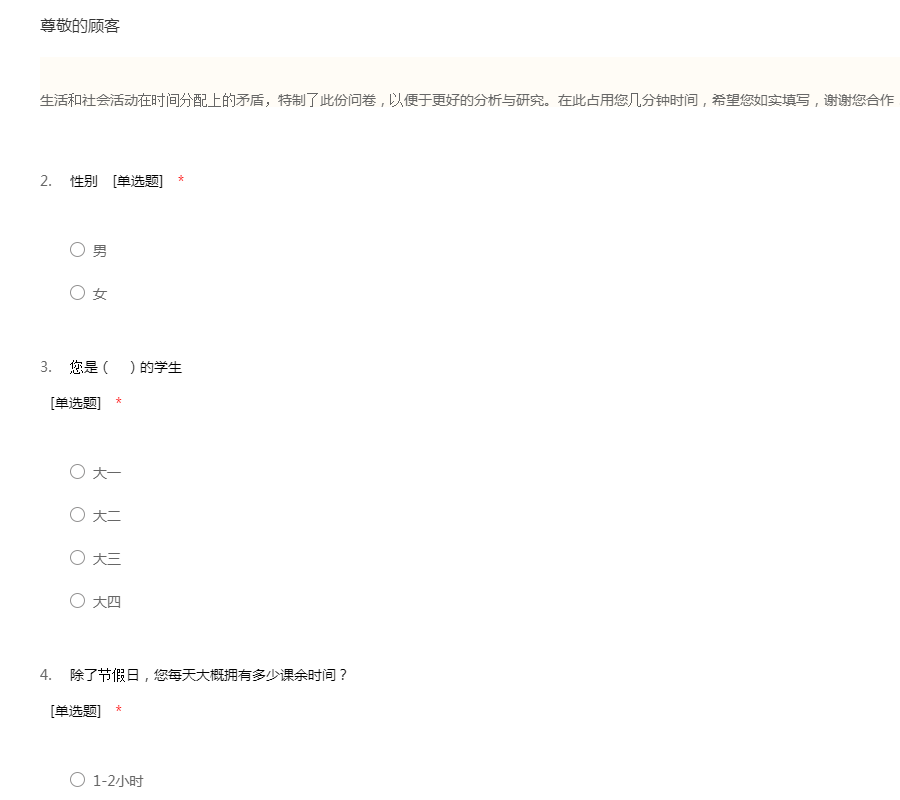 亲爱的同学们,为了对大学生课余时间安排有所了解,通过透析课余时间安排,加强课余时间利用效率,特作此问卷调查,感谢大家支持与合作!