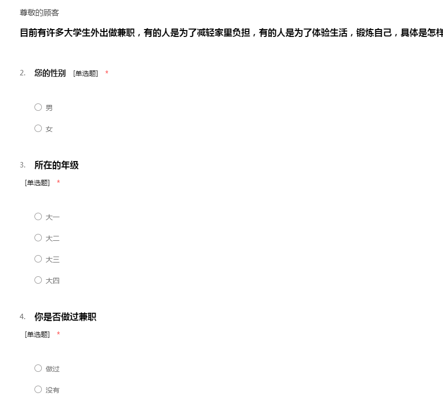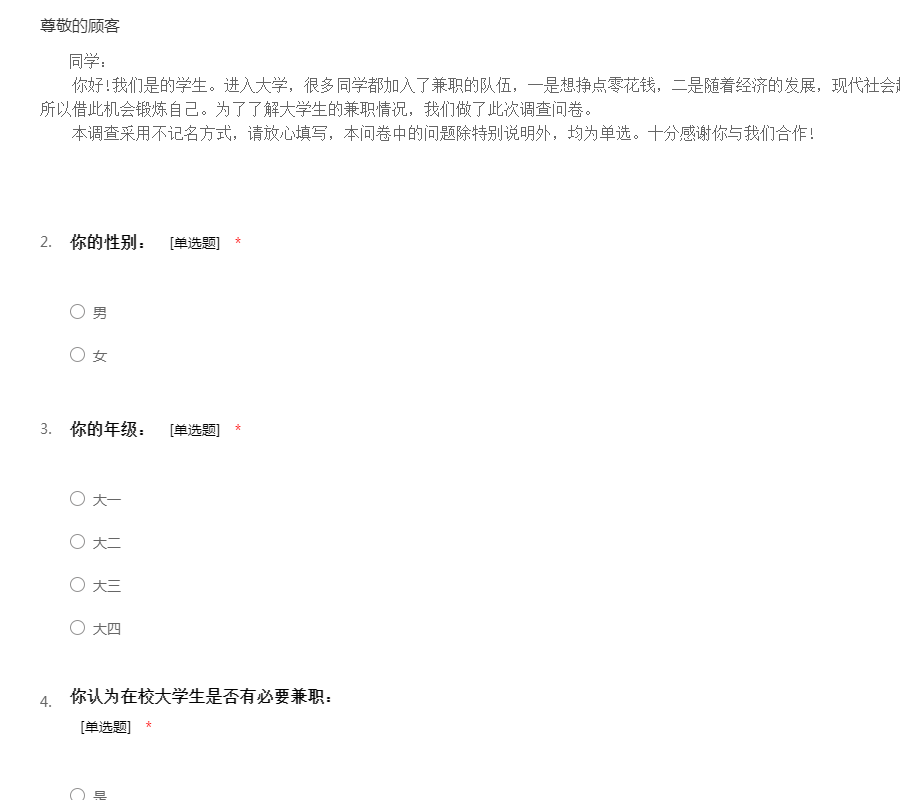 同学: 你好!我们是的学生。进入大学,很多同学都加入了兼职的队伍,一是想挣点零花钱,二是随着经济的发展,现代社会越来越要求大学生具备很强的能力,所以借此机会锻炼自己。为了了解大学生的兼职情况,我们做了此次调查问卷。 本调查采用不记名方式,请放心填写,本问卷中的问题除特别说明外,均为单选。十分感谢你与我们合作!