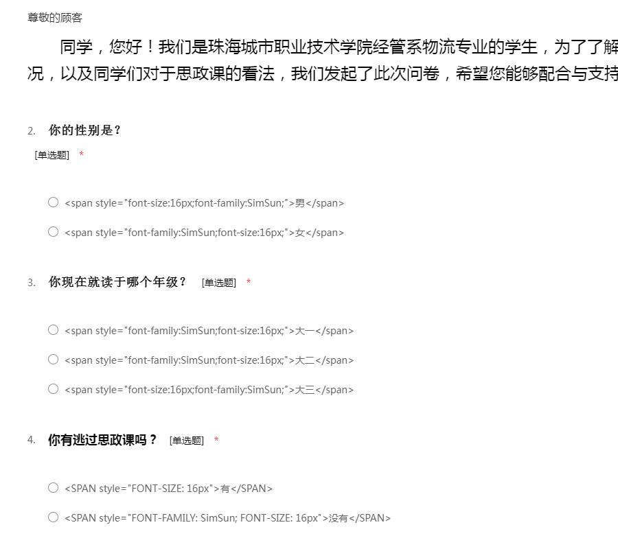 同学,您好!我们是珠海城市职业技术学院经管系物流专业的学生,为了了解我校思政课逃课的情况,以及同学们对于思政课的看法,我们发起了此次问卷,希望您能够配合与支持,谢谢!