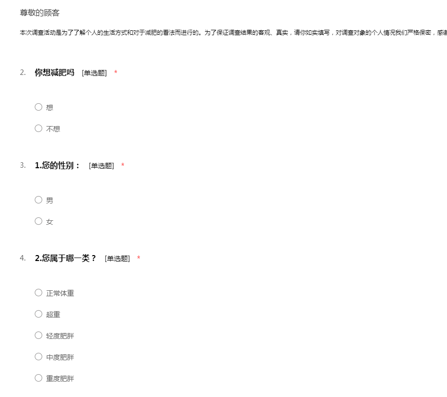 本次调查活动是为了了解个人的生活方式和对于减肥的看法而进行的。为了保证调查结果的客观、真实,请你如实填写,对调查对象的个人情况我们严格保密,感谢您的支持。