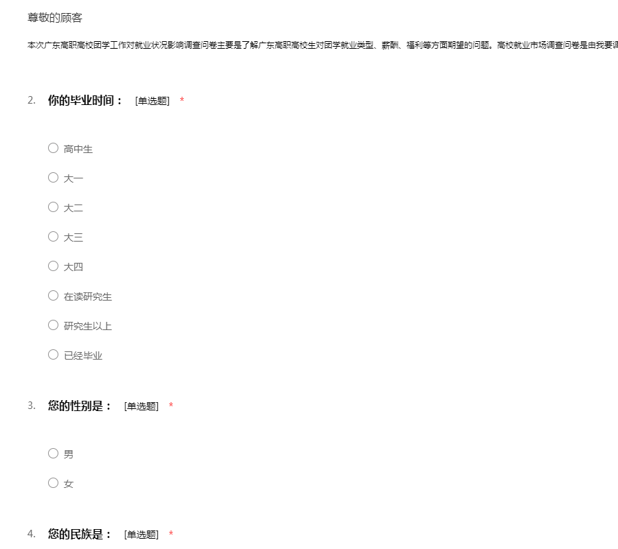 本次广东高职高校团学工作对就业状况影响调查问卷主要是了解广东高职高校生对团学就业类型、薪酬、福利等方面期望的问题。高校就业市场调查问卷是由我要调查网(http://www.51diaocha.com)提供。
