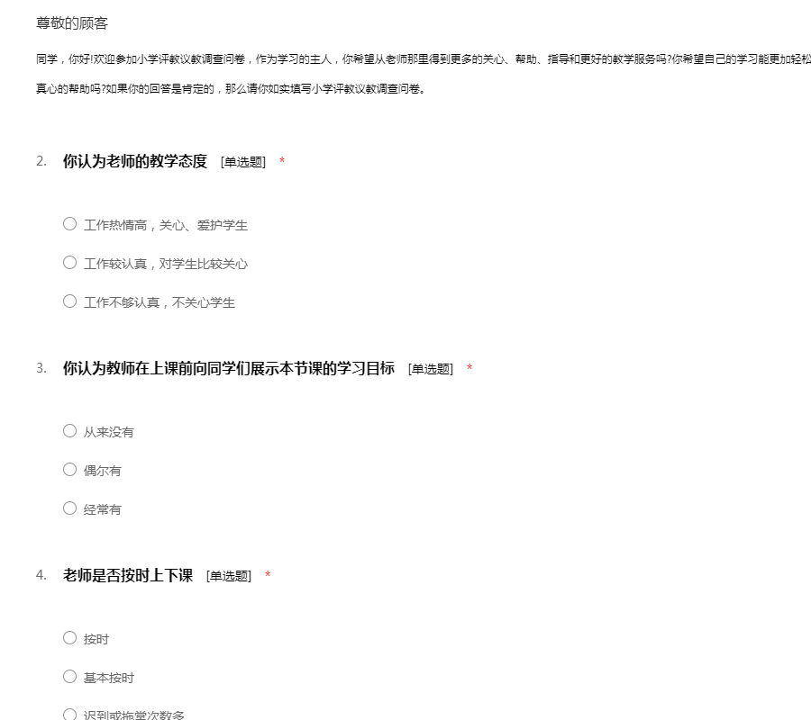 同学,你好!欢迎参加小学评教议教调查问卷,作为学习的主人,你希望从老师那里得到更多的关心、帮助、指导和更好的教学服务吗?你希望自己的学习能更加轻松而且有效吗?你希望为你老师的发展、进步提供真心的帮助吗?如果你的回答是肯定的,那么请你如实填写小学评教议教调查问卷。