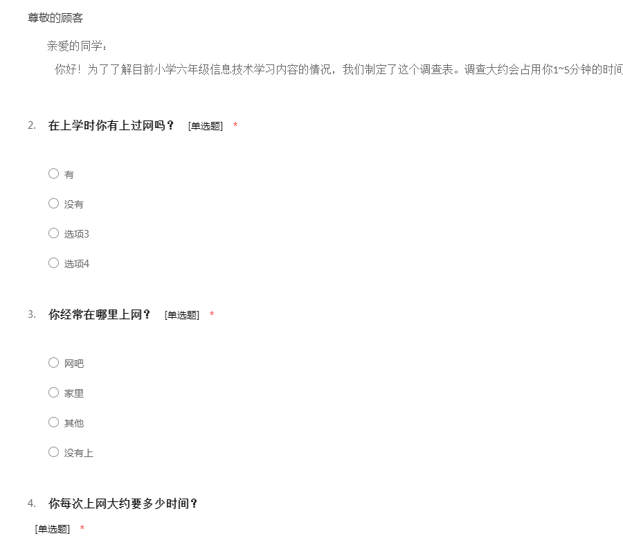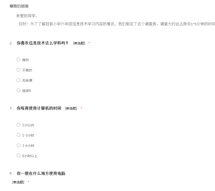 亲爱的同学: 你好!为了了解目前小学六年级信息技术学习内容的情况,我们制定了这个调查表。调查大约会占用你1~5分钟的时间,谢谢你的帮助。