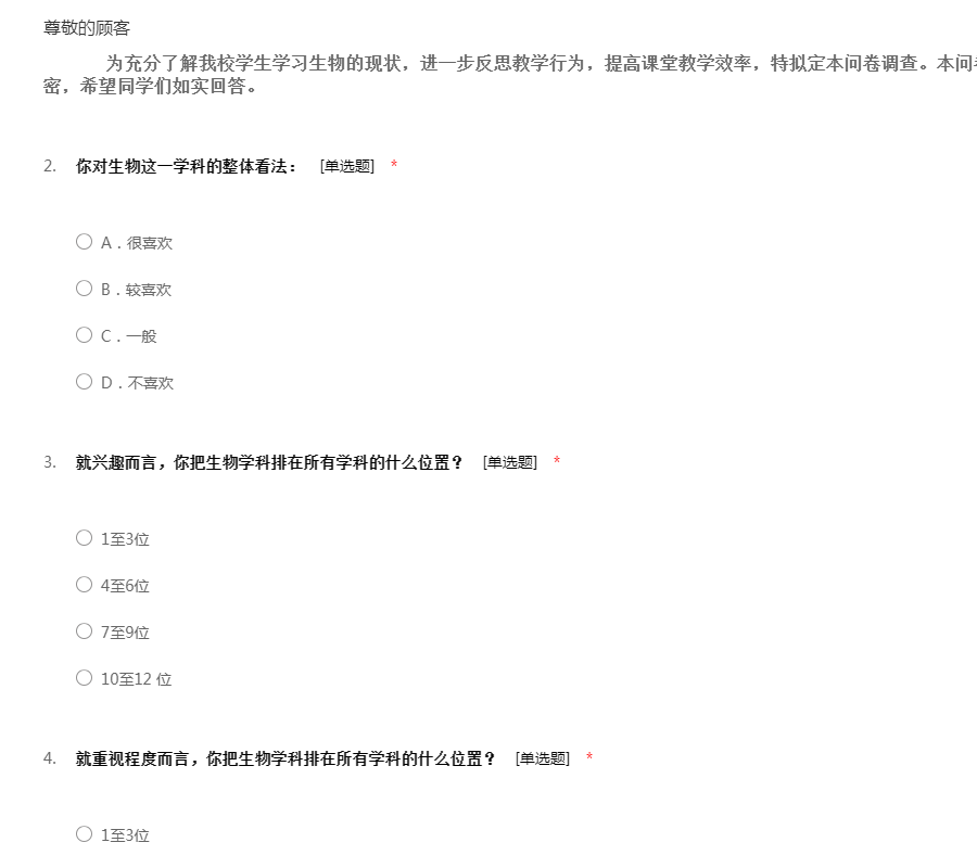 为充分了解我校学生学习生物的现状,进一步反思教学行为,提高课堂教学效率,特拟定本问卷调查。本问卷不记名,对每位学生的内容保密,希望同学们如实回答。