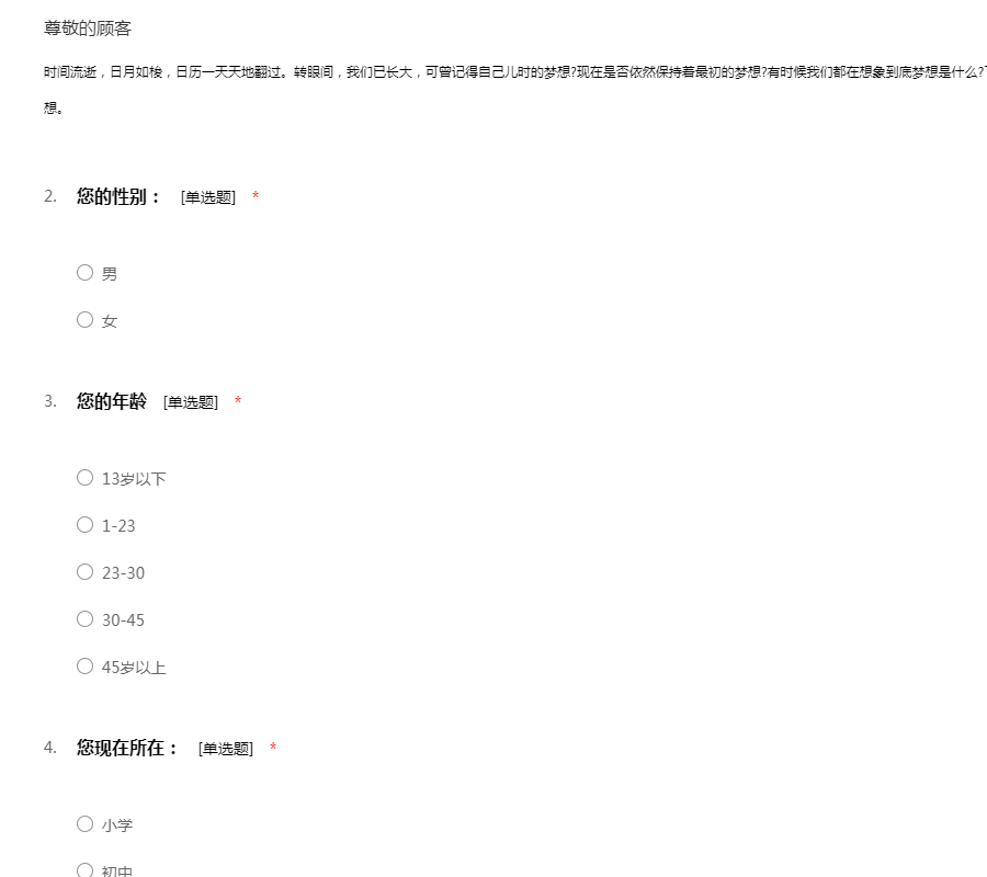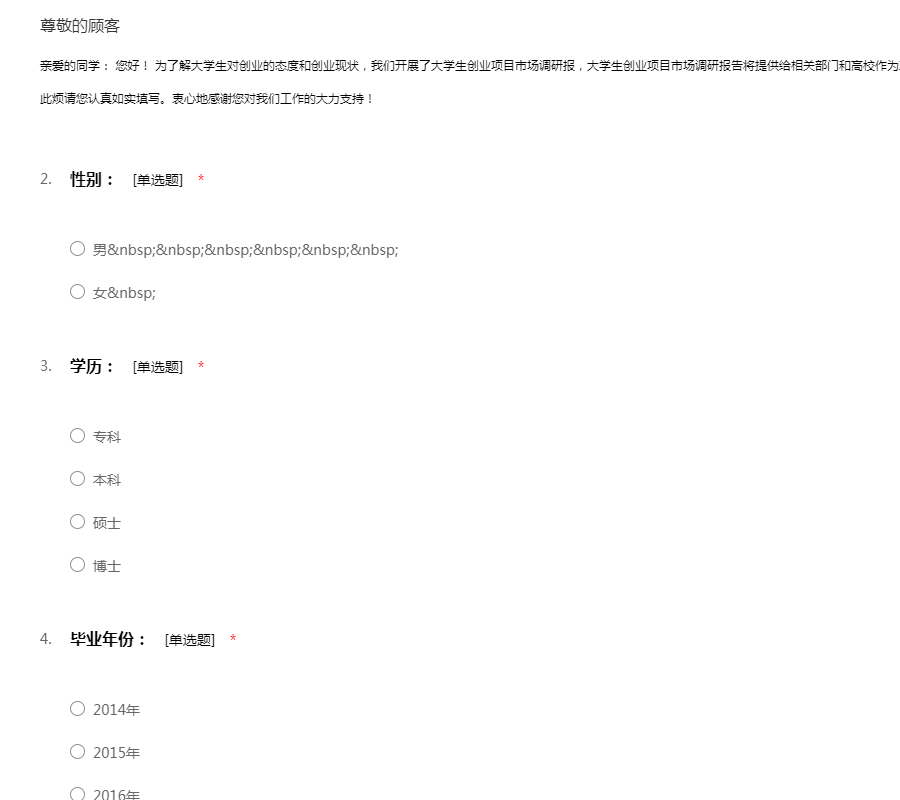 亲爱的同学: 您好! 为了解大学生对创业的态度和创业现状,我们开展了大学生创业项目市场调研报,大学生创业项目市场调研报告将提供给相关部门和高校作为政策制定的参考。您的回答对我们非常重要,因此烦请您认真如实填写。衷心地感谢您对我们工作的大力支持!