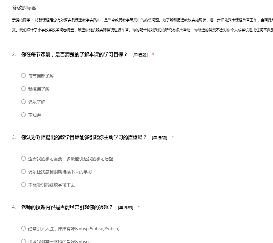 亲爱的同学: 将新课程理念有效落实到课堂教学实践中,是当今教育教学研究中的热点问题。为了解和把握教改实施现状,进一步深化我市课程改革工作,全面提升教育教学质量,我们正在围绕有效教学进行研究。我们设计了小学教学改革问卷调查,希望你能按照实际情况进行作答。你的配合将对我们的研究有很大帮助,你所选的答案不会对你个人或学校造成任何不良影响。谢谢你的合作!