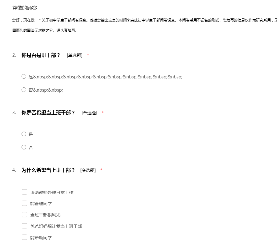 您好,现在做一个关于初中学生干部问卷调查。感谢您抽出宝贵的时间来完成初中学生干部问卷调查。本问卷采用不记名的形式,您填写的信息仅作为研究所用,无对错之分。 公司绩效管理方面的问题的看法,因而您的回答无对错之分。请认真填写。
