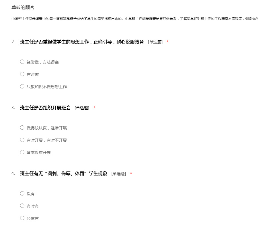 中学班主任问卷调查中的每一道题都是综合总结了学生的意见提炼出来的。中学班主任问卷调查结果只做参考,了解同学们对班主任的工作满意态度程度,谢谢你的支持。