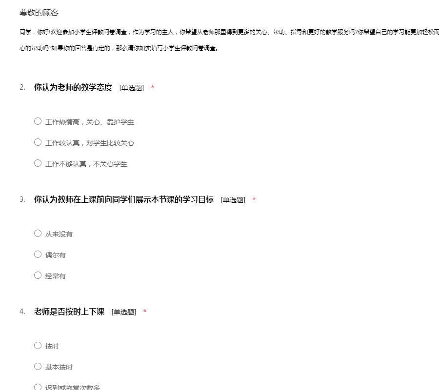 同学,你好!欢迎参加小学生评教问卷调查,作为学习的主人,你希望从老师那里得到更多的关心、帮助、指导和更好的教学服务吗?你希望自己的学习能更加轻松而且有效吗?你希望为你老师的发展、进步提供真心的帮助吗?如果你的回答是肯定的,那么请你如实填写小学生评教问卷调查。