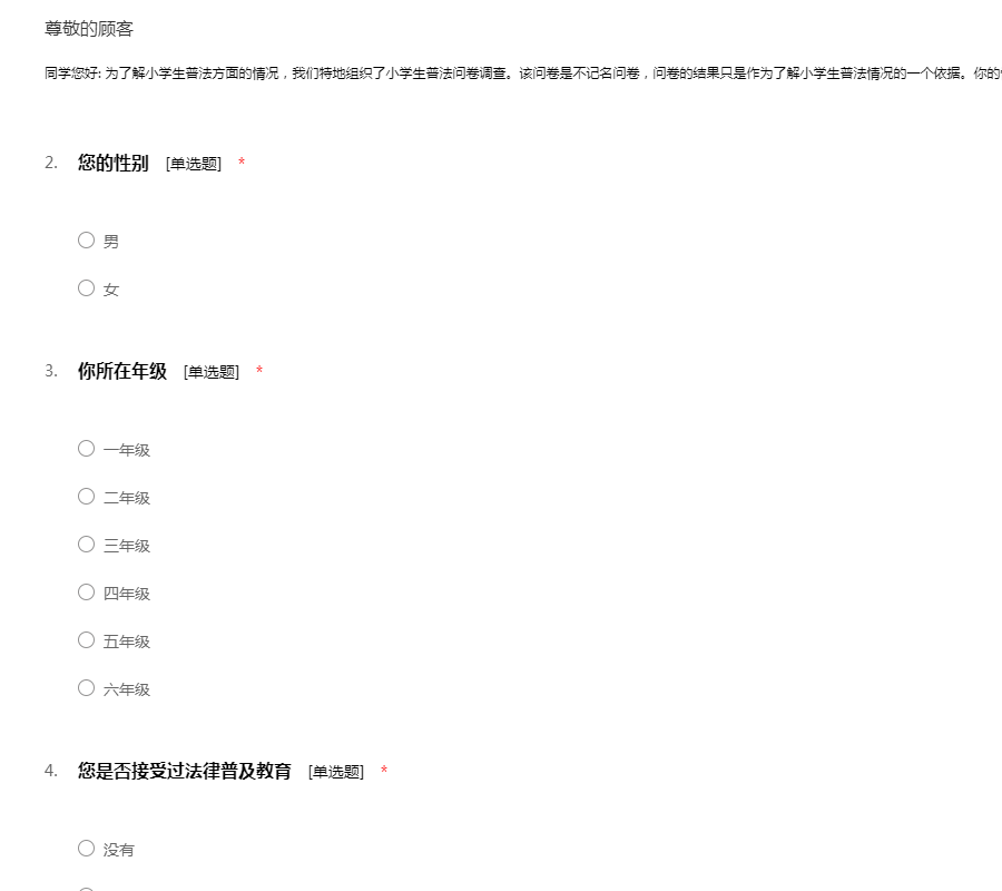 同学您好: 为了解小学生普法方面的情况,我们特地组织了小学生普法问卷调查。该问卷是不记名问卷,问卷的结果只是作为了解小学生普法情况的一个依据。你的情况我们将严格保密,希望你能客观如实填写