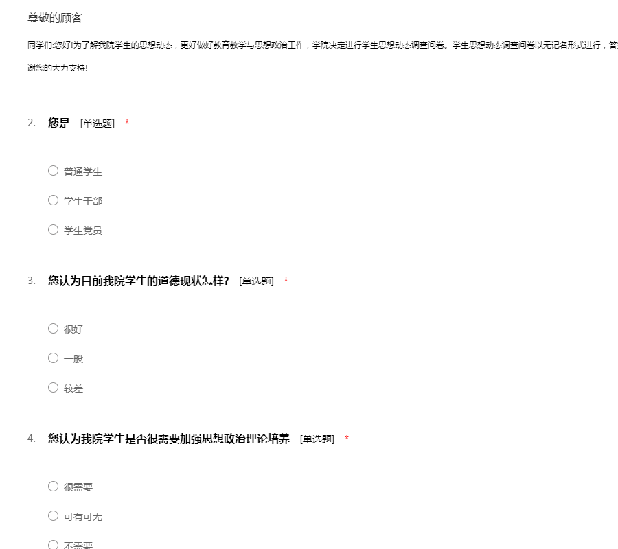 同学们:您好!为了解我院学生的思想动态,更好做好教育教学与思想政治工作,学院决定进行学生思想动态调查问卷。学生思想动态调查问卷以无记名形式进行,答案无所谓对错,请表达您的真实和看法。衷心感谢您的大力支持!
