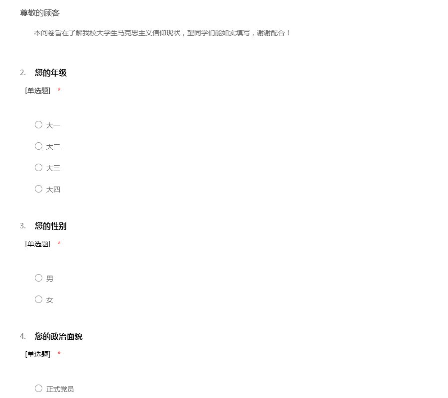 本问卷旨在了解我校大学生马克思主义信仰现状,望同学们能如实填写,谢谢配合!