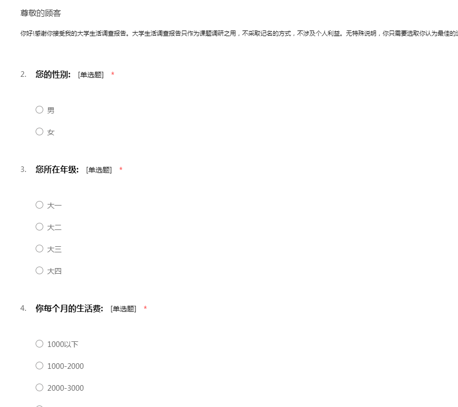 你好!感谢你接受我的大学生活调查报告。大学生活调查报告只作为课题调研之用,不采取记名的方式,不涉及个人利益。无特殊说明,你只需要选取你认为最佳的选项。谢谢你的参与和合作!