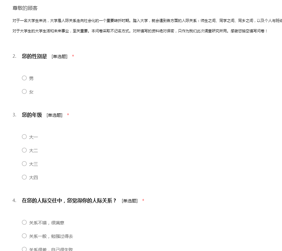 对于一名大学生来说,大学是人际关系走向社会化的一个重要转折时期。踏入大学,就会遇到各方面的人际关系:师生之间、同学之间、同乡之间,以及个人与班级、学校之间的关系等等。如何处理好人际关系,对于大学生的大学生活和未来事业,至关重要。本问卷采取不记名方式。对所填写的资料绝对保密,只作为我们此次调查研究所用。感谢您抽空填写问卷!