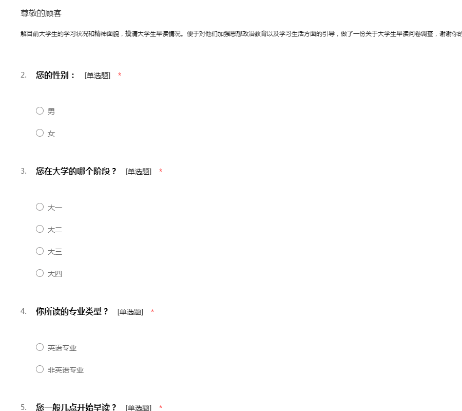 解目前大学生的学习状况和精神面貌,摸清大学生早读情况。便于对他们加强思想政治教育以及学习生活方面的引导,做了一份关于大学生早读问卷调查,谢谢你的配合。