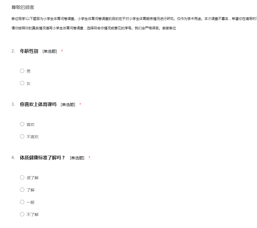 各位同学!以下题目为小学生体育问卷调查。小学生体育问卷调查的目的在于对小学生体育锻炼情况进行研究。仅作为学术用途。本次调查不署名,希望你在填写时不要有任何的顾虑。每一道题都没有标准答案,请你按照你的真实情况填写小学生体育问卷调查,选择符合你情况或意见的序号。我们会严格保密。谢谢各位