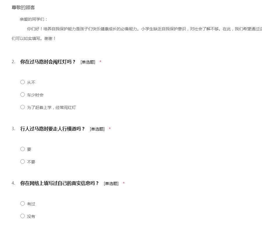 亲爱的同学们: 你们好!培养自我保护能力是孩子们快乐健康成长的必备能力。小学生缺乏自我保护意识,对社会了解不够。在此,我们希望通过这份问卷了解一下小学生的安全意识,请你们可以如实填写。谢谢!