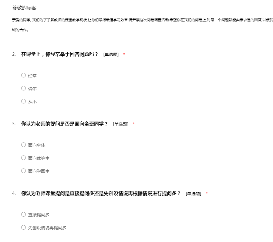 亲爱的同学, 我们为了了解教师的课堂教学现状,让你们取得最佳学习效果,特开展这次问卷调查活动,希望你在我们的问卷上,对每一个问题都能实事求是的回答,以便我们能准确掌握分析情况,促进教学工作。谢谢你真诚的合作。