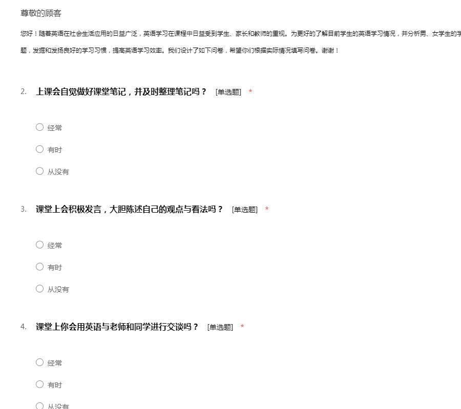 您好!随着英语在社会生活应用的日益广泛,英语学习在课程中日益受到学生、家长和教师的重视。为更好的了解目前学生的英语学习情况,并分析男、女学生的学习习惯的差异,以便让学习者能对照自我发现问题,发掘和发扬良好的学习习惯,提高英语学习效率。我们设计了如下问卷,希望你们根据实际情况填写问卷。谢谢!