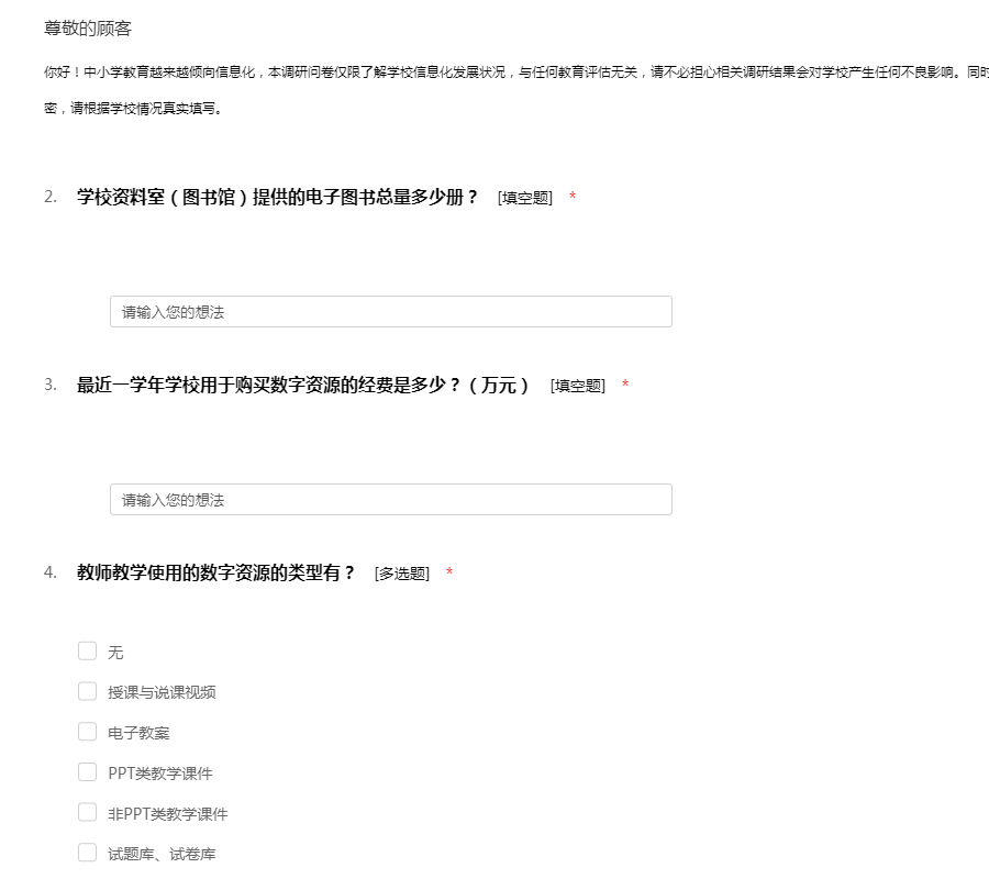你好!中小学教育越来越倾向信息化,本调研问卷仅限了解学校信息化发展状况,与任何教育评估无关,请不必担心相关调研结果会对学校产生任何不良影响。同时,我们会对相关信息按国家有关法律规定严格保密,请根据学校情况真实填写。