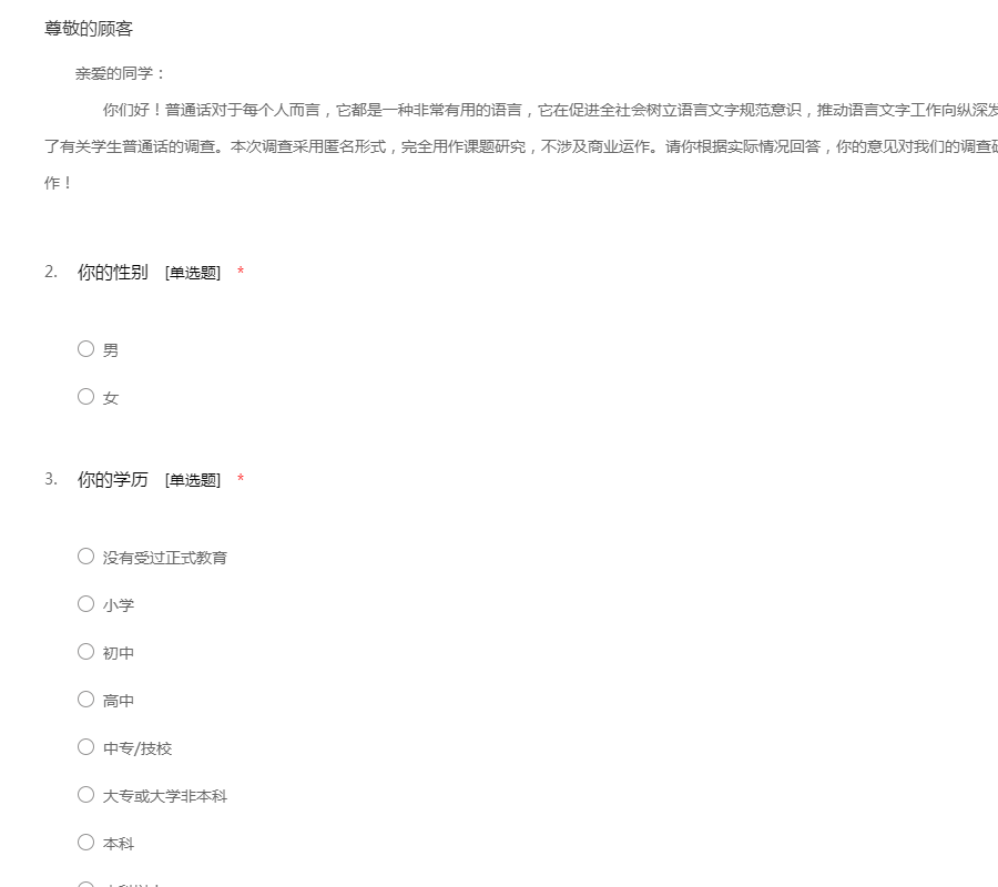 亲爱的同学: 你们好!普通话对于每个人而言,它都是一种非常有用的语言,它在促进全社会树立语言文字规范意识,推动语言文字工作向纵深发展方面发挥了重要的作用。因此我们进行了有关学生普通话的调查。本次调查采用匿名形式,完全用作课题研究,不涉及商业运作。请你根据实际情况回答,你的意见对我们的调查研究非常重要。非常感谢你的支持与合作!