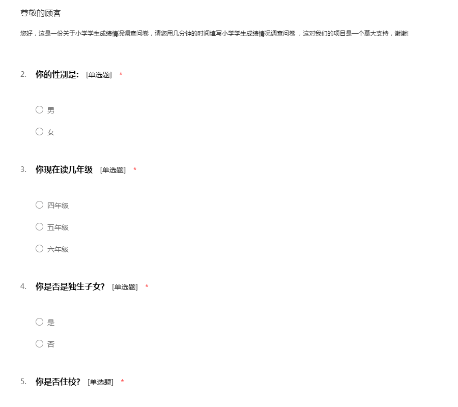 您好,这是一份关于小学学生成绩情况调查问卷,请您用几分钟的时间填写小学学生成绩情况调查问卷 ,这对我们的项目是一个莫大支持,谢谢!